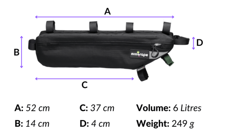 Internode 6 waterproof Miss Grape 's frame bag . Roomy and extremely resistant, it is designed not only for long journeys, but also for day trips and for those who use the bicycle daily as a means of urban transport.