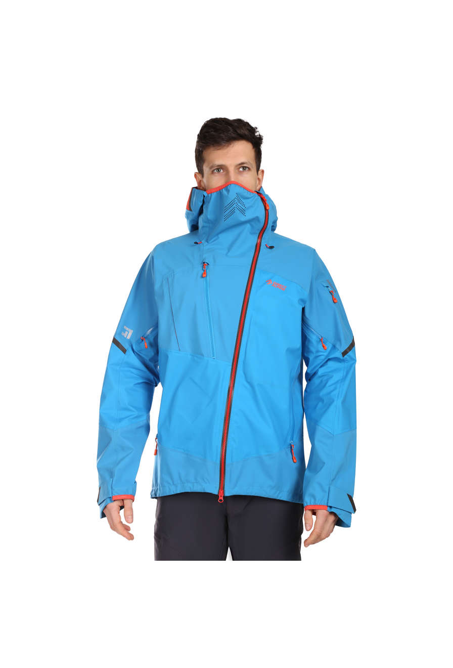 Мъжкото яке GUIDE Hardshell има изместен, двупосочен централен цип и висока яка, който покрива лицето и носа, предотвратявайки навлизането на вятър, дъжд или сняг. Вътрешната страна на яката е облицована с мек материал, който защитава мембраната от изтъркване и осигурява комфорт при напълно закопчано яке. Яката също така има дихателни отвори за по-лесна вентилация, когато е напълно закопчана.
