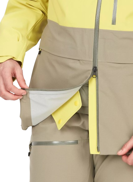 • Фиксираната подплата стои вътре в якето ви и прегръща талията ви, за да не пуска сняг и гарантира, че средният и основният ви слой остават сухи